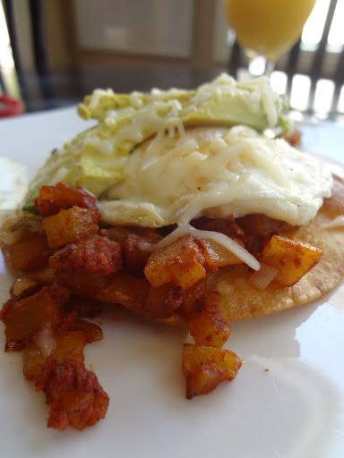 Fry tortilla in vegetable oil and set aside. Dice potatoes and onion and sauté in pan with vegetable oil, salt and pepper to taste. Once potatoes are tender, put chorizo and sauté a few minutes and set aside. Fry egg over easy, salt and pepper to taste. Next build your tostada: fried tortilla, chorizo con papas, fried egg, avocado and cheese. Enjoy!