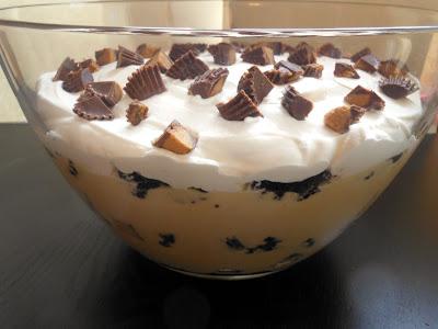 On top of the peanut butter pudding put a 2nd layer of brownies, followed by a 2nd layer of peanut butter cups and the rest of the pudding. Top the 2nd layer of pudding with the remaining brownies. Spoon the rest of the whipped cream on top smoothing it out evenly. Top the whipped cream with the remaining peanut butter cups.