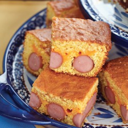 Place 4 slices of American cheese evenly over the hotdogs,and then cover all with the remaining 2/3 of the batter. Bake for 30-35 minutes, until the top has browned well and a toothpick inserted into the center comes out clean. Let cool 5 minutes before slicing. Serve with ketchup or mustard, as you would eat an ordinary corn dog.
