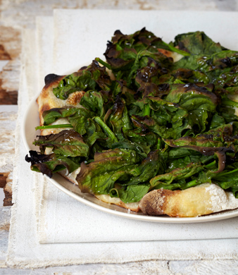 This pizza is one of my most popular dishes, a kind of warm spinach salad on a crust. I've been serving it since the earliest days at Sullivan Street (its origins—how I came to make it—are now lost in the mists of memory). But, even today, to the best of my knowledge, I'm the only one who offers it. Try it at home, and right after that first bite, you'll see why it's one of the most popular pies I've ever devised. When I make the Popeye in my home kitchen, I deviate from the usual system in this book and bake it (as called for here) rather than placing it under the broiler. The image of that mound of spinach directly under flame just seems wrong—I'm not even sure what would happen, but it wouldn't be as good.
