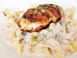 Wrap each piece of chicken with a strip of bacon and put a good sear on it. Mix soup, flour and sour cream together; pour over chicken. Cover and cook on low 8-10 hours or high for 3-4 hours. Serve over hot buttered egg noodles.