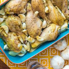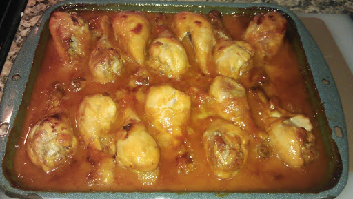mix first three ingredients together, place chicken legs in an oven proof pan, poor the mixture oven the chicken legs, turn chicken to coat, bake for one hour, turn chicken half way through, serve with white rice covered with sauce.