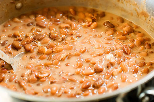 Rinse beans in cool water; pour into a pot, cover with water by 2 to 3 inches. Bring to a boil, then reduce heat and cover. Simmer 2 hours, or until beans are tender. Add water to pot as needed. Beans should have a thick broth. Toward end of cooking time, add salt and pepper and season to taste. Don’t over-salt. For a variety try adding chili powder, garlic or Tabasco.