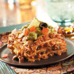 Spread 1 cup meat mixture in a greased 13-in. x 9-in. baking dish. Layer with two tortillas, a third of the remaining meat mixture and 1 cup cheese. Repeat layers. Top with remaining tortillas and meat mixture.