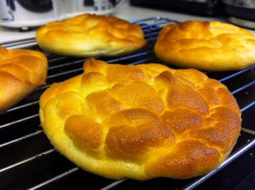 1 Preheat oven to 300 degrees. 2 Separate the eggs very carefully, there must be no yolk in the white. 3 In one bowl, mix together the egg yolks, the 3 T. of Cottage Cheese OR Cream Cheese and the one packet of Sweetener until smooth. 4 In the other bowl add 1/4 teaspoon of Cream of Tartar to the whites and beat the whites on high speed until they are fluffy and form nice peaks. 5 Very carefully fold the egg yolk mixture into the egg whites until mixed, but try and not break down the fluffiness of the egg whites too much. 6 Spray two cookie sheets with Pam or other fat-free cooking spray. 7 With a large spoon, "scoop" the mixture into 10 even rounds on the sheets (about the size of the top-half of the McDonalds hamburger bun; roughly 3/4 inch thick and 4 to 5 inches across). 8 Bake on the middle rack. Here is when you have to watch them, because the cooking time the same on any two batches. It is somewhere around 1/2 hour, but it could be less or more. You just need to watch them until them become nice and golden brown (again, the color of a McDonalds bun). 9 Remove from the pans and cool on a rack or cutting board. 10 While warm they are crumbly and similar to cooked meringue - but don't let this fool you! Once completely cool, seal them in a ziplock storage baggie or a tupperware over night. They will totally change their consistency, to something much more like bread - a softer texture that is nice and chewy. If you do not like softer chewy bread, then eat them as they are, nice and crisp. 11 Since the sides that were facing the pan are perfectly flat, you use these to spread things on, or make sandwiches, or even as a burger bun! The choice is up to you, and you will be quite amazed at how much like a bun these really are!
