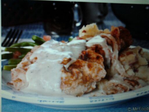 To make gravy, melt butter in skillet, then add flour. Slowly stir in milk and cook until thickened. Stir in salt and pepper, pour over pork chops, and serve immediately.