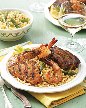Grill chicken over direct heat, covered, 2–3 minutes. Place lamb beside chicken over direct heat and grill, covered, 2–3 minutes. Flip chicken and lamb, baste grilled side with glaze, and grill, covered, 2–3 minutes more. Move chicken and lamb to indirect heat and baste with glaze again. Arrange shrimp over direct heat and grill, covered, 2 minutes per side, basting once. Chicken is done when an instant-read thermometer inserted into the thickest part registers 165°. Lamb is done when a thermometer inserted near but not touching the bone registers 135° for medium-rare. Off heat, baste chicken, lamb, and shrimp with remaining glaze.