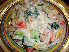 Drain fettuccine and toss with sauce and vegetable mixture.