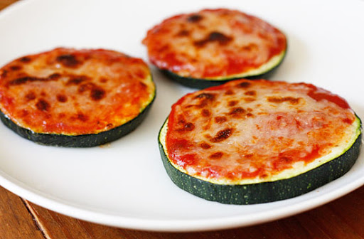 Cut zucchini about 1/4 inch thick. Spray both side lightly with oil and season with salt and pepper. Broil or grill for about 2 minute on each side. Top with sauce and cheese and broil for an additional minute or two. (Careful not to burn cheese)