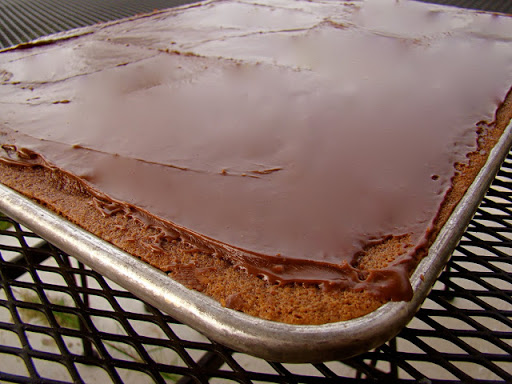 Pour into a large cookie sheet pan and bake at 350 for 30 minutes. Frost while cake is still warm.
