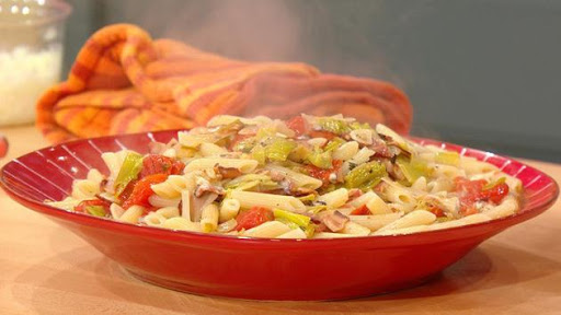 Heat EVOO in a large skillet over medium-high heat. Add bacon and crisp; add leeks, garlic, thyme and pepper. Sauté 5-6 minutes then deglaze the pan with wine. Add tomatoes and cover pan. Cook tomatoes until they burst, 10-12 minutes, shaking pan occasionally.