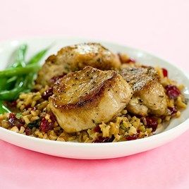 2. Add remaining oil, onion, and walnuts to empty skillet and cook until onion is softened, about 5 minutes. Add sage and cook until fragrant, about 30 seconds. Stir in cranberries, rice, and orange juice and cook until liquid has evaporated, about 3 minutes. Season with salt and pepper. Spoon rice onto individual plates and top with pork. Serve.