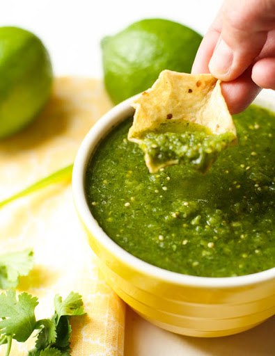 Notes: Use tomatillos that are a light green to yellow in color, they are sweeter than the dark green ones. 8 Medium tomatillos equals about 1 pound. This salsa uses raw tomatillos, no need to cook. Put the tomatillos in the blender first, it will be easier to puree.