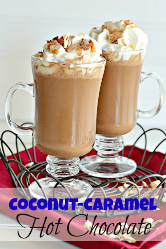 Place milk, melted chocolate, peanut butter and caramel in a blender; cover and process until smooth. Transfer to a medium saucepan. Cook over medium heat until warmed through, stirring occasionally. Pour into mugs and top with whipped cream and coconut, if desired.