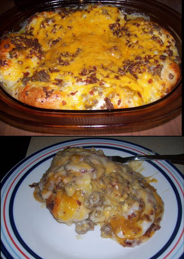 Then, take the biscuits and it into 1" pieces and line bottom of pan. Brown sausage and scatter over biscuits. Sprinkle with Cheddar Cheese.