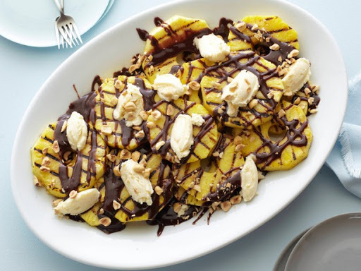 Transfer the pineapple slices to a large platter. Drizzle the warm chocolate-hazelnut sauce over.
