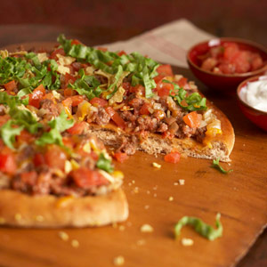 1. Lightly coat a 12- to 13-inch pizza pan with nonstick cooking spray. Pat dough evenly into prepared pan, building up edges slightly. (If dough is hard to pat out, allow to rest for 10 minutes.) Prick crust all over with a fork. Bake in a 425 degrees oven for 12 minutes. 2. Meanwhile, in a large skillet cook the ground beef and onion until meat is brown and onion is tender. Drain off fat. Stir in the 2/3 cup salsa. Top partially baked crust with meat mixture. Bake for 5 minutes more. Sprinkle with tomatoes and cheese. Bake for 2 to 3 minutes more or until cheese melts. 3. To serve, top with lettuce and tortilla chips. If desired, serve with sour cream and/or additional salsa.