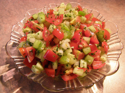 - 1 large tomato, sliced and diced (I use a bunch of grape tomatoes & quarter them) Not too many seeds that way!