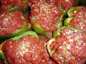 Peppers Preparation: Carefully remove stems from peppers, slice in half lengthwise and remove seeds. In a heavy skillet, brown meat in olive oil until crumbly. 1. Add onion, tomato paste, stock and herbs. 2. Bring to a boil and cook until liquid has reduced by about one half. 3. Stir in rice and season to taste. Set the pepper halves in a buttered Pyrex dish, fill each with stuffing and top with cheese. Bake for about 1 hour at 325°. Brown Rice Preparation: Place rice and warm water mixture in a flameproof casserole and leave in a warm place for at least 7 hours. Bring to a boil, reduce heat, stir in salt and butter and cover tightly. Without removing lid, cook over lowest possible heat for about 45 minutes.