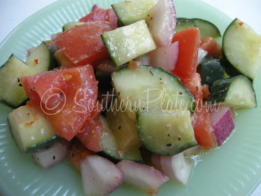 Place all vegetables in large bowl. Pour entire bottle of dressing over, stir. Cover and refrigerate for several hours before serving. Can be kept in the refrigerator for several days.