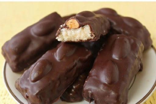 2. Using Two Fork method (or a special dipping tool), dunk coconut logs in chocolate, bring up and tap on lip of bowl to remove excess chocolate. Place on parchment lined baking sheet and repeat.