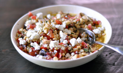 When the corn has cooled, stand each ear up in a wide, shallow bowl and slice the corn kernels off with a chef's knife. Toss the corn with the tomatoes.