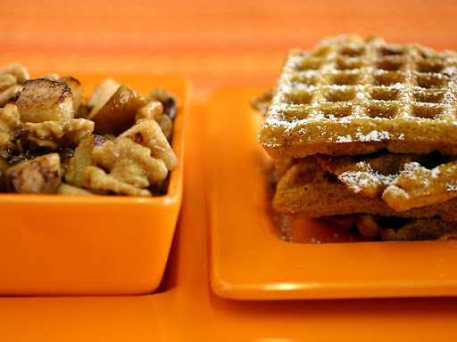 Pour and spread about 1 cup batter into the waffle iron. Cover and cook until crisp and a rich golden brown, about 7 minutes. (Try to resist the temptation to open the waffle iron too soon. Steam will puff out of the iron while the waffles cook, when this stops the waffle is cooked.) Repeat with the remaining batter. Serve hot with the apples.