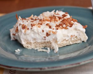 Topping: Spread 1 cup flaked coconut onto a cookie sheet and bake for 2-3 minutes until toasted and golden. Set aside. In a stand mixer beat whipping cream, sugar, and vanilla until soft peaks form.