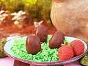 Boil and mash potatoes, then cool to room temperature. Add butter to potatoes. Mix potatoes, sugar, and vanilla extract, and chill in the refrigerator for 1 hour. The mixture should be the consistency of marzipan. Divide into 16 equal pieces and roll into egg shapes. Freeze them for 30 minutes. Dip pieces into melted chocolate to cover, transfer to a rack for the chocolate to harden. Serve cold.