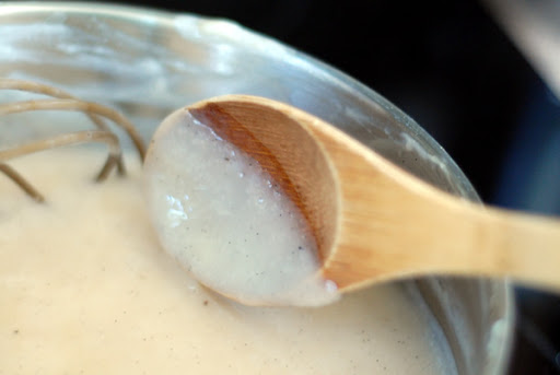 Now take the saucepan and heat over medium heat. Add the 2 1/2 cups nondairy milk, sugar and vanilla. Whisk frequently (every 3 to 5 minutes).