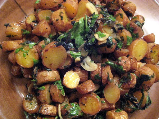 Turn heat to high and add potatoes. Season with salt and pepper and saute without moving much, until golden brown on both sides. Add 1/2 the greens and all the onion and cook over medium heat for another 1-2 minutes until wilted. Add vinegar and cook for 30 more seconds. Toss with the remaining 1/2 of greens and serve.