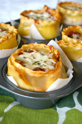 For assembly- Preheat oven to 350 degrees. Line 12 jumbo muffin tins with squares of parchment paper. If they don’t stay in on their own, that’s ok–the pasta will help with that. Line the edges of the muffin tins with 1 pasta sheet per cup. {Pasta sheet will overlap about 2 inches.} Spoon about 1/2 tablespoon of sauce into the bottom of each cup {#1}. Next cut 9 pasta sheets into quarters and press one of these pieces of pasta into the bottom on top of the sauce {#2}. Top pasta sheet with a generous tablespoon of sauce {#3} and then a generous tablespoon of cheese filling {#4}. Repeat this pasta-sauce-cheese layering one more time being sure to press out any air bubbles. Top these lasagna cups off with a 3rd piece of pasta, more sauce and the remaining mozzarella cheese. Bake for 25-30 minutes or until everything is hot and bubbly. Serve hot.
