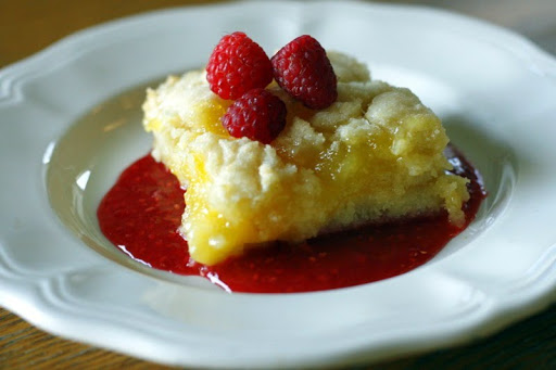 To serve, ladle some raspberry puree into the center of a dessert plate. Set a piece of the cake on top and garnish with raspberries. You may also add a sprinkle of powdered sugar and a dollop of whipped cream if you like.
