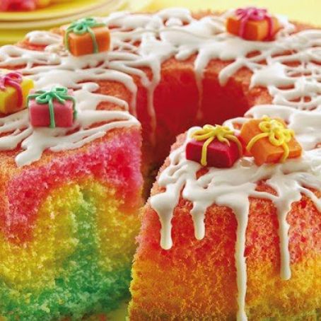 Divide batter evenly among 3 bowls. Gently stir 6 to 8 drops of one food color into each of the batters. Pour red batter into ungreased 10-inch angel food (tube) cake pan. (Do not use fluted tube cake pan or 9-inch angel food pan or batter will overflow.) Spoon yellow batter over red batter. Spoon green batter over top.