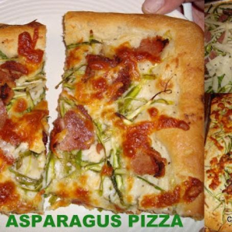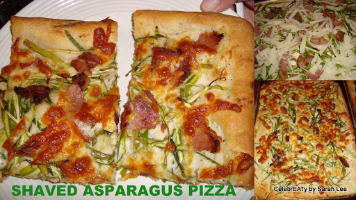 Fresh asparagus in a pizza, that is screaming "oh yeah" to me. I love pizza, I love asparagus, and having them both is fabulous to the highest degree. Use any of your go-to pizza crust (store-bought, from scratch, or from a box like Jiffy), top with a thin layer of white sauce (Alfredo or bechamel, available in jars but, really it's so easy to make it with just few ingredients) and shaved asparagus (we do same thing with fresh green beans, sauteed along with browned ground beef, yumm).