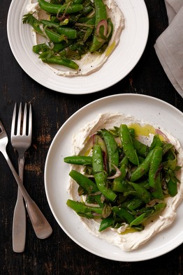 This dish combines crisp, sweet sugar snap peas, creamy ricotta and a dressing of mint leaves, scallions and parsley. Eat it with a fork or with your hands, crudité-style.