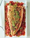 5.Spoon the tomatoes and their juices onto a long serving platter. Using 2 long spatulas, carefully slide the salmon filet onto the tomatoes, leaving the skin behind, if desired. Top the salmon with the jalapeños and serve.