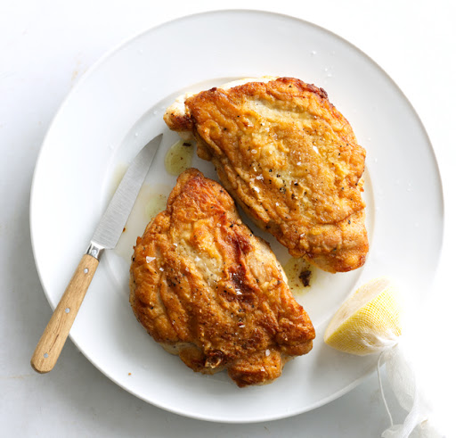 Preheat oven to 400°. Using a thin, flexible knife, cut chicken breasts away from bones, leaving skin intact. Place chicken between 2 sheets of plastic wrap; using a mallet or heavy skillet, pound chicken until 1/2-inch thick (which will help it cook evenly and stay juicy). Season chicken with salt and pepper. Dust with flour; shake off excess.