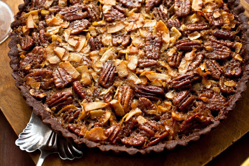 4. Melt the remaining stick of butter. In a bowl, combine butter, honey, cream, brown sugar, egg, bourbon and 1/8 teaspoon salt. Stir in the coconut and pecans. Pour filling into the crust. Bake until the top is golden brown and the filling is gently set, 35 to 45 minutes. Cool completely before serving.