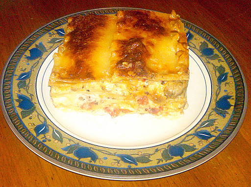 in a 9 X 13 pan, Layer cooked noodles, 1/3 of meat mixture, 1/3 cottage/ricotta cheese,1/3 tomato mixture, 1/4 Mozzarella.