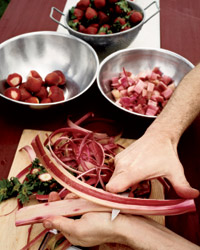 Preheat the oven to 375°. In a bowl, toss the rhubarb with 3/4 cup of the sugar and let stand for 15 minutes, stirring occasionally. In another bowl, toss the strawberries with the remaining 1/2 cup sugar and let stand for 10 minutes, stirring occasionally. Using a slotted spoon, transfer the rhubarb to the strawberries; discard any rhubarb juice. Add the cornstarch, lemon juice and vanilla to the fruit and stir well. Transfer the mixture to a 9-by-13-inch glass baking dish.