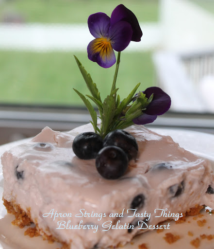 To serve, slice into squares and garnish each square with a sprinkle of graham crumbs and a few blueberries. You can also garnish with edible flowers, as in the photo. Enjoy! For step-by-step instructions with photos, visit my blog Apron Strings and Tasty Things at www.foodandfact.com