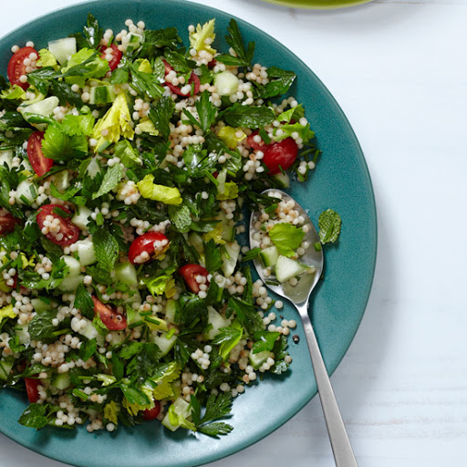 Add the parsley, lovage, mint, chives, jalapeño, tomatoes and cucumber to the couscous and toss well. Season with salt and pepper and serve.