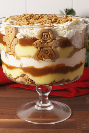 Crumble gingerbread into the bottom of a trifle dish. Pour 1/2 of the pudding mixture over the gingerbread. Drizzle caramel on top then add a layer of whipped topping. Line the sides of the trifle dish with whole gingerbread cookies. Repeat with the remaining gingerbread, pudding, and whipped topping. Sprinkle of the top with crushed gingerbread cookies, if desired.