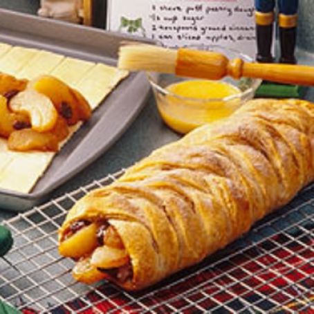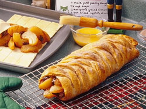 Spoon mixture down center of dough. Cut slits in dough 1 inch apart lengthwise down each side of filling. Brush each 1-inch dough strip with beaten egg and fold over dough.
