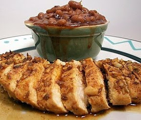 In a 2 quart baking dish, mix together beans and the above mixture. Bake until thick and bubbly, about 60-70 minutes.