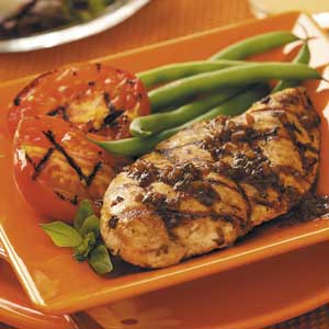 Cut remaining tomatoes in half; grill or broil for 2-3 minutes on each side or until tender. Serve with chicken and reserved dressing. Yield: 4 servings.