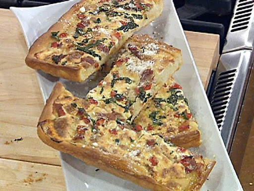 Punch dough down and place in a lightly oiled 9X13 sheet pan. Cover with a damp kitchen towel or plastic wrap and allow to double in size again, about 30 minutes. Using your hands, press dough so that it fits evenly across the entire pan.
