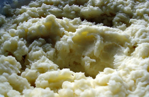 In a Dutch oven pot, add water 1/2 of the way to the top of the pot. Add the potatoes and add additional water just until the water barely covers the potatoes. Cook the potatoes on MEDIUM-HIGH heat for 45 minutes. Drain the potatoes and place them in a large bowl. Mash the potatoes and the butter with a potato masher. Add the milk and use a hand mixer to finish mixing the potatoes to a creamy consistency. Serve the potatoes hot with butter or gravy.