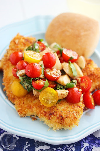 Crispy Parmesan Chicken Cutlets with Tomato-Mozzarella Salad